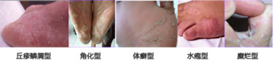 金華婺城皮膚病防治院皮膚病醫(yī)生指出,根據(jù)皮膚損害形態(tài)不同,可將足癬(腳氣)分為5種常見(jiàn)的類型:
