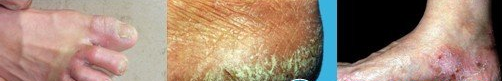 (3)鱗屑角化型:癥狀是足底、足緣、足跟部皮膚腳趾增厚、粗糙、脫屑,鱗屑成片狀或小點(diǎn)狀,反復(fù)脫落。冬季趾縫間皮膚發(fā)生裂隙,夏季產(chǎn)生水皰,有痛感。常因搔抓引起繼發(fā)性感染,并發(fā)膿包瘡、淋巴管炎、淋巴結(jié)炎、蜂窩組織炎、丹毒、敗血癥等疾患。