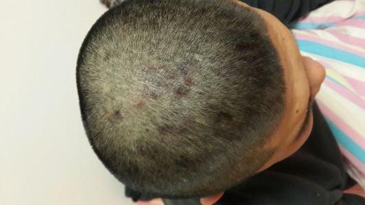 2、黃癬:每個(gè)年齡段都有可能會(huì)出現(xiàn),但是兒童感染的幾率比較高,典型皮損為盤(pán)狀黃豆大小的黃癬痂,中心貫穿有毛發(fā),病發(fā)參差不齊,干枯無(wú)光澤,愈后形成萎縮性疤痕,永久性禿發(fā)。