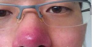 3、鼻贅期:鼻贅期又稱為肥大期,常見于40歲后的男性。病程遷延日久,鼻部皮脂腺和皮膚組織增生肥厚,血管擴張。患者會發(fā)現(xiàn)鼻頭明顯增大,高出皮面的分葉狀的、大小不等、高低不平的柔軟結節(jié),最終導致畸形的鼻贅。