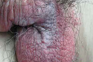 4、陰囊瘙癢癥:限于陰囊,也可累及會陰,陣發(fā)性發(fā)作,皮損肥厚、濕疹樣變、苔癬樣變、及色素沉著。