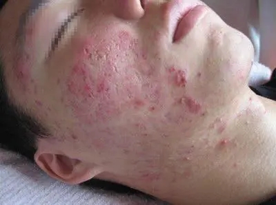 6、萎縮性痤瘡:丘疹或膿皰性痤瘡破壞腺體而形成凹坑狀萎縮性瘢痕。