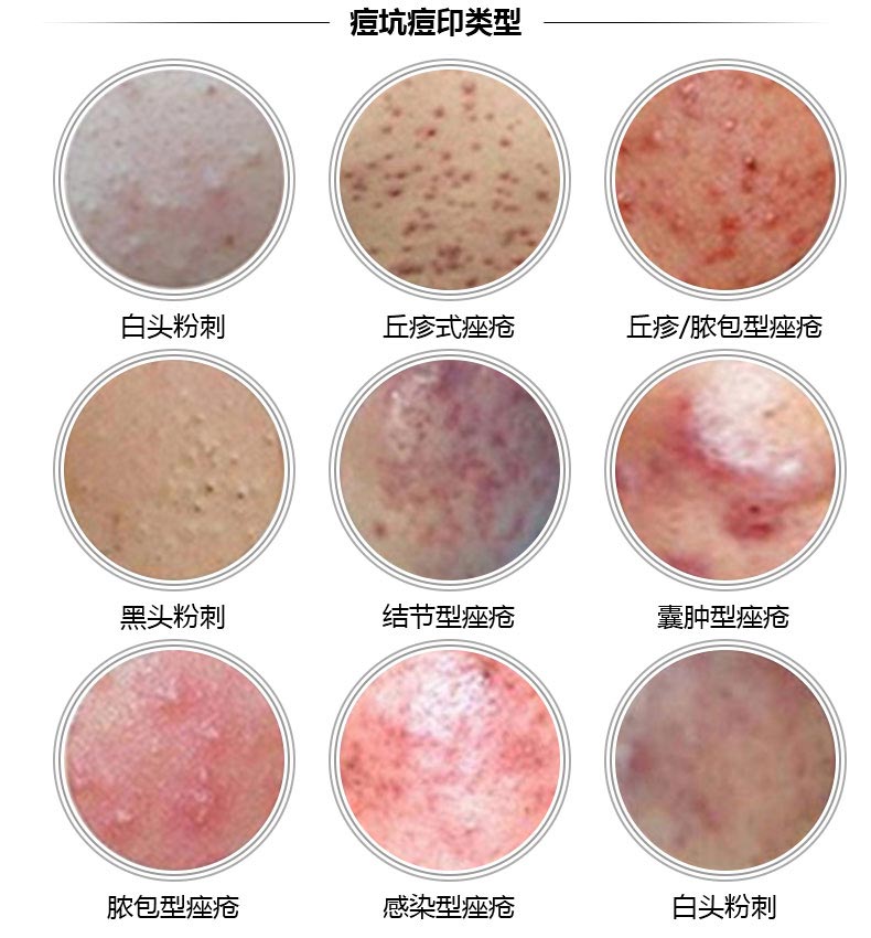 痤瘡俗稱“青春痘”,又叫“面皰”“粉刺”“酒刺”“暗瘡”等,是由于毛囊及皮脂腺阻塞,發(fā)炎所引發(fā)的一種慢性炎癥性皮膚病。通常好發(fā)于面部、頸部、胸背部、肩膀和上臂。臨床以白頭粉刺、黑頭粉刺、炎性丘疹、膿皰、結(jié)節(jié)、囊腫等為主要表現(xiàn)。這種疾病青春期多見(jiàn),但也不完全受年齡階段的限制,從兒童到成人,幾乎所有年齡段的人都可以發(fā)病。如果你懷疑自己得了痤瘡,可以對(duì)照下面譜圖;如果你還是不能確定,可以聯(lián)系我們,幫你診斷病情。