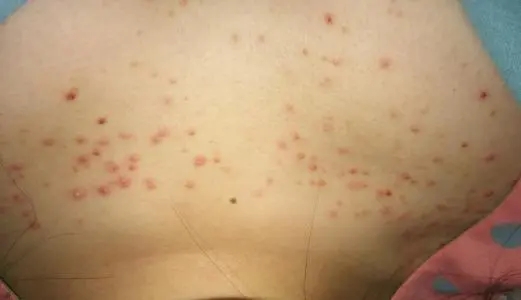 5、毛囊炎:背上長小紅疙瘩,還要考慮是毛囊炎的可能性。毛囊炎是由金黃色葡萄球菌感染毛囊引起的炎癥,好發(fā)于頭皮、后頸及胸背部。毛囊炎初起為紅色充實(shí)性丘疹,皮疹數(shù)目多,但不融合,以后迅速發(fā)展成丘疹性膿瘡?;緭p害呈與毛囊一致的紅色丘疹,其中心有毛發(fā)貫穿,頂端迅速化膿形成膿點(diǎn),周圍繞以紅暈。以后排出少量膿液,繼而干燥、結(jié)痂,痂脫不留痕跡,患者會(huì)自覺瘙癢或輕度疼痛。