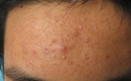 痤瘡好發(fā)于顏面、胸背部多脂區(qū),偶爾也發(fā)生于其他部位,對稱分布,眼眶周圍常不受侵犯,初起損害多為黑頭粉刺,加以擠壓,可見由頭部呈黑色而體部呈黃白色,半透明的脂栓排除。繼而出現(xiàn)紅色小丘疹,皮疹頂端可出現(xiàn)小膿皰,破潰或吸收后遺留暫時性色素沉著或小凹狀疤痕。少數(shù)嚴重患者,除黑頭粉刺、丘疹、膿皰外,還可見有蠶豆至指甲大小的炎性結節(jié)或囊腫。囊腫可化膿,形成膿腫,破潰后常形成竇道和疤痕。