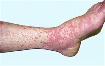 1、皮膚癥狀:以下肢大關(guān)節(jié)附近及臀部分批出現(xiàn)對稱分布、大小不等的斑丘疹樣紫癜為主,紫癜可突出皮面、伴輕微癢感,初為鮮紅色,繼而為暗紅色、褐色。