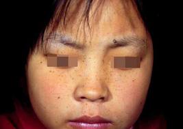 雀斑是發(fā)生面部皮膚上的黃褐色點(diǎn)狀色素沉著斑,系常染色體顯性遺傳。日曬可誘發(fā)和加重皮損。多在3~5歲左右出現(xiàn)皮損,女性較多。其數(shù)目隨年齡增長(zhǎng)而逐漸增加。好發(fā)于面部,特別是鼻部和兩頰,可累及頸、肩、手背等暴露部位,非暴露部位無皮疹。損害為淺褐或暗褐色針頭大小到綠豆大斑疹,圓形、卵圓形或不規(guī)則。散在或群集分布,孤立不融合。無自覺癥狀。夏季經(jīng)日曬后皮疹顏色加深、數(shù)目增多,冬季則減輕或消失。常有家族史。