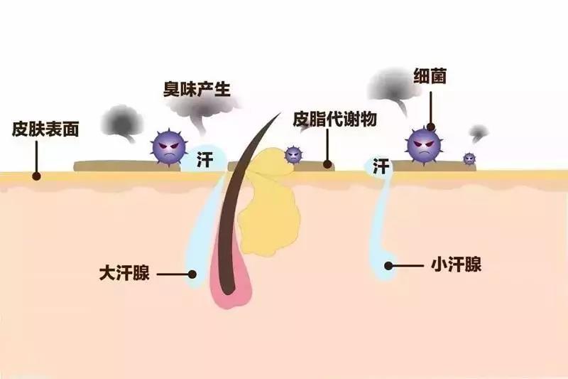 形成腋臭的主要是因為分布于腋下皮膚真皮層,開口于毛根部的頂漿汗腺(又名大汗腺),會分泌較濃稠的液體(主要為油脂、蛋白質、淀粉),經(jīng)腋下上的細菌分解分泌從而形成的惡臭味的短鏈脂肪酸和氨。大蒜、砷劑通過小汗腺排泄也易形成臭味。除了汗腺分泌,遺傳、生理、個人生活習慣都可以形成腋臭。