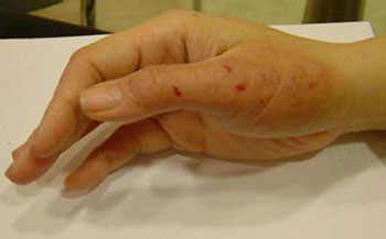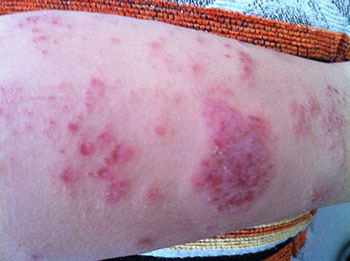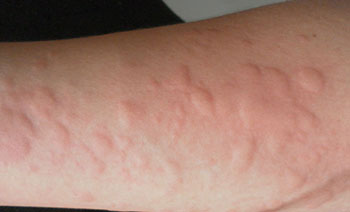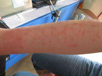 2、丘疹性蕁麻疹:丘疹性蕁麻疹又稱急性單純性癢疹。典型皮損為綠豆或稍大淡紅色丘疹,性質堅硬,頂端常有小皰,搔破后結痂,周圍有紡錘形紅暈,經(jīng)搔抓后呈現(xiàn)風團。該病好發(fā)于軀干及四肢近端,損害數(shù)目不定,常分批出現(xiàn),散在發(fā)生或少數(shù)簇集,常伴有胃腸障礙,少數(shù)患者有時亦有呈現(xiàn)水皰者。
